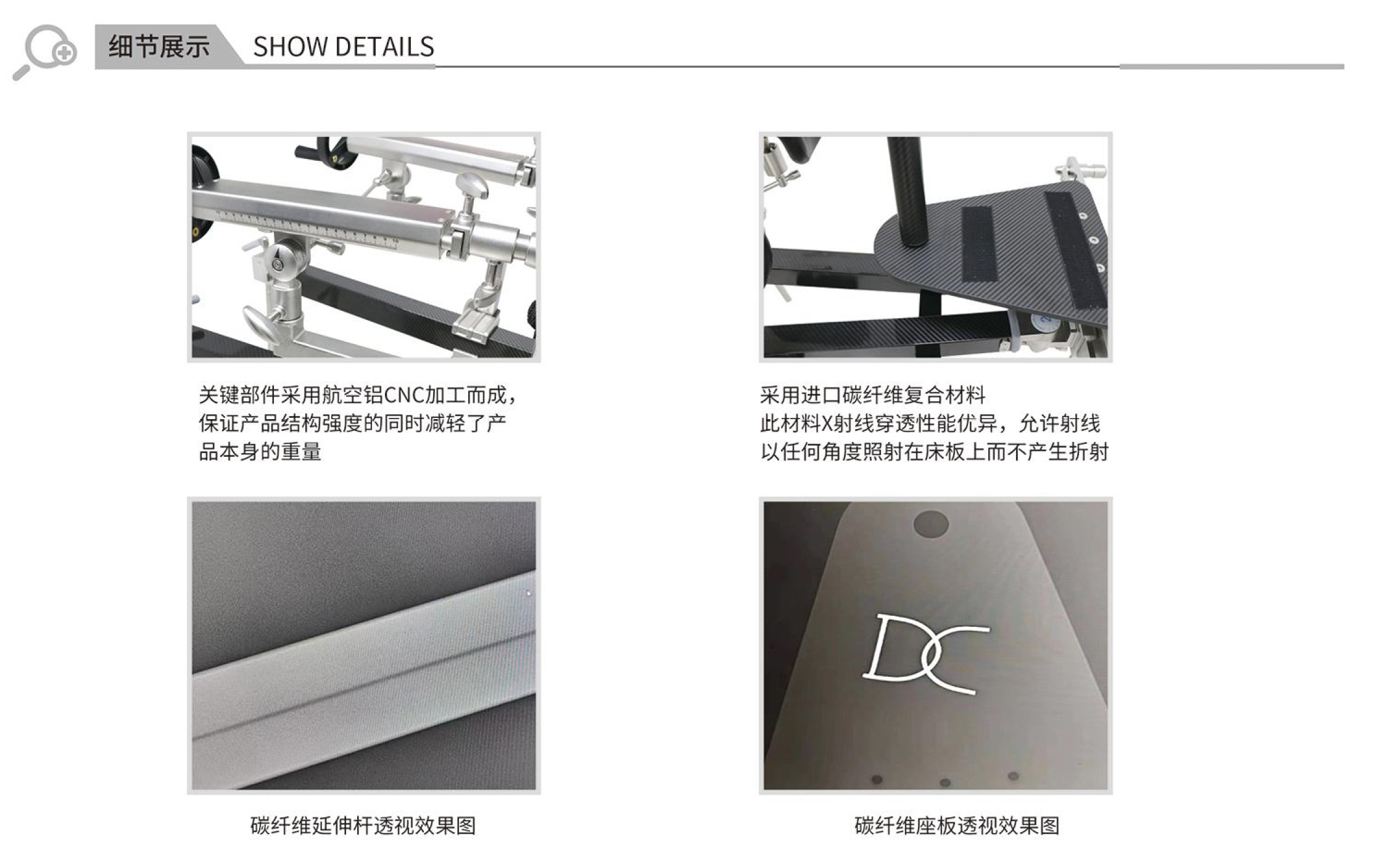 (1)輕質(zhì)高強:碳纖維材料具有極高的比強度和比模量,這使得牽引架在保持足夠強度和穩(wěn)定性的同時,能夠大大減輕整體重量。這不僅方便了患者的移動和搬運,也減輕了醫(yī)護人員的操作負(fù)擔(dān)。
